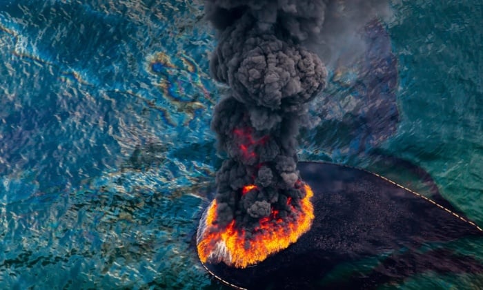 En 2010 dans le Golfe du Mexique, une fuite pétrolière de grande envergure. Sur la photo, l'or noir brûle sur l'océan, un type d'incendie extrêmement difficle à stopper.