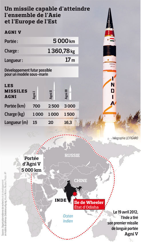Jusqu'ici, la portée la plus longue d'un missile indien s'établit à 3500 kilomètres, avec l'Agni III. «L'Inde est enfin au même niveau que la Chine pour ce qui est des armes de dissuasion», relève Bharat Karnad, expert en questions de sécurité au Center for Policy Research, un think tank de Delhi.