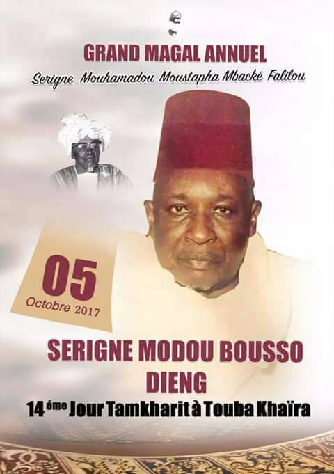 La communauté mouride va célébrer, le 05 Octobre prochain, le  Magal de Touba Khaïra dédié au premier Khalife de Cheikh Mohammed Fadel Mbacké dit Serigne Falilou, Serigne Moustapha Falilou Mbacké plus connu sous le nom de Serigne Modou Bousso Dieng. Né en 1921 à Ndindy, cet illustre petit –petit de Serigne Touba a eu à  veiller  sur l’héritage de son père  Serigne Fallou Mbacké pendant 32 ans (1968-2000), avant d’être succédé  par Cheikh Mouhammed Lamine Bara Mbacké Falilou (2000, date de son rappel à Dieu).