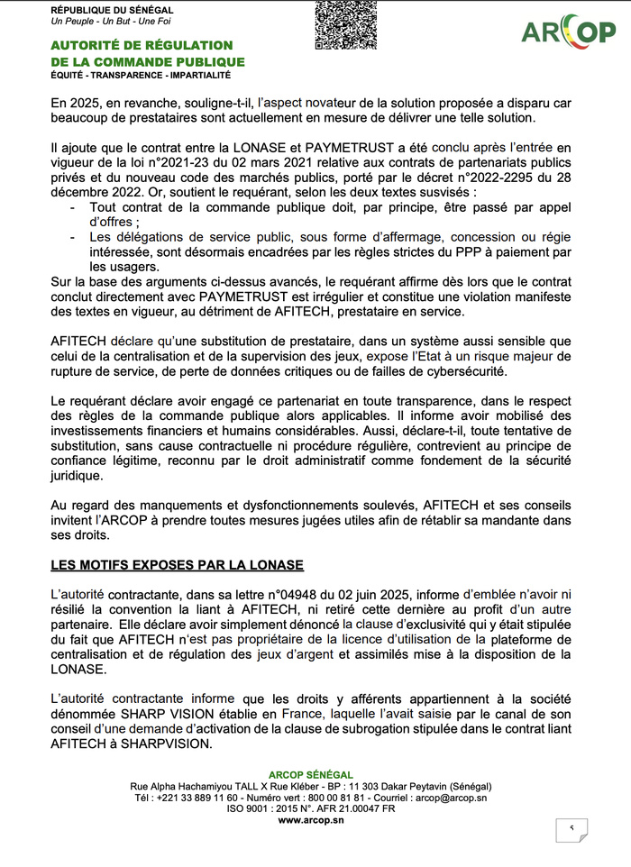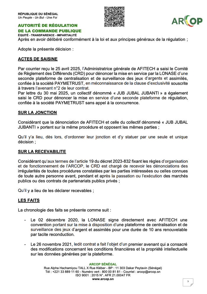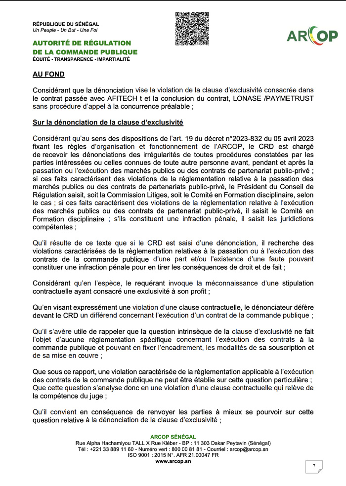 Le comité de règlement des différends de l'Autorité de régulation des marchés publics (ARCOP) a tranché dans le litige entre AFITECH et la LONASE. Il a estimé qu'il y a eu une « violation caractérisée de la réglementation applicable à l’exécution des contrats de la commande publique », un différend qui relève de la compétence du juge. Par conséquent, l'ARCOP a renvoyé les deux parties devant la justice pour la question relative à la dénonciation de la clause d'exclusivité.