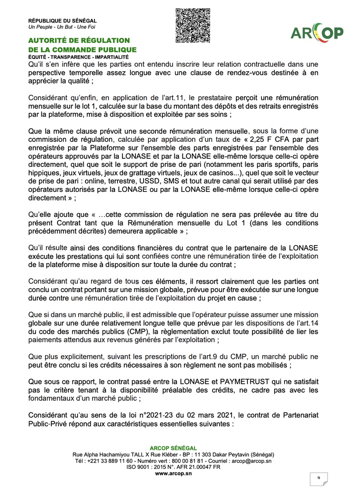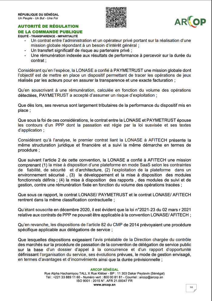 L'ARCOP a rappelé que la dénonciation de la violation d’une clause d’exclusivité relève de la compétence du juge. Elle a aussi constaté que la convention LONASE/PAYMETRUST remplit les critères d’un contrat de Partenariat Public Privé (PPP). Étant donné que la procédure applicable n'a pas été respectée, l'ARCOP a déclaré que la contractualisation est irrégulière pour les deux cas.