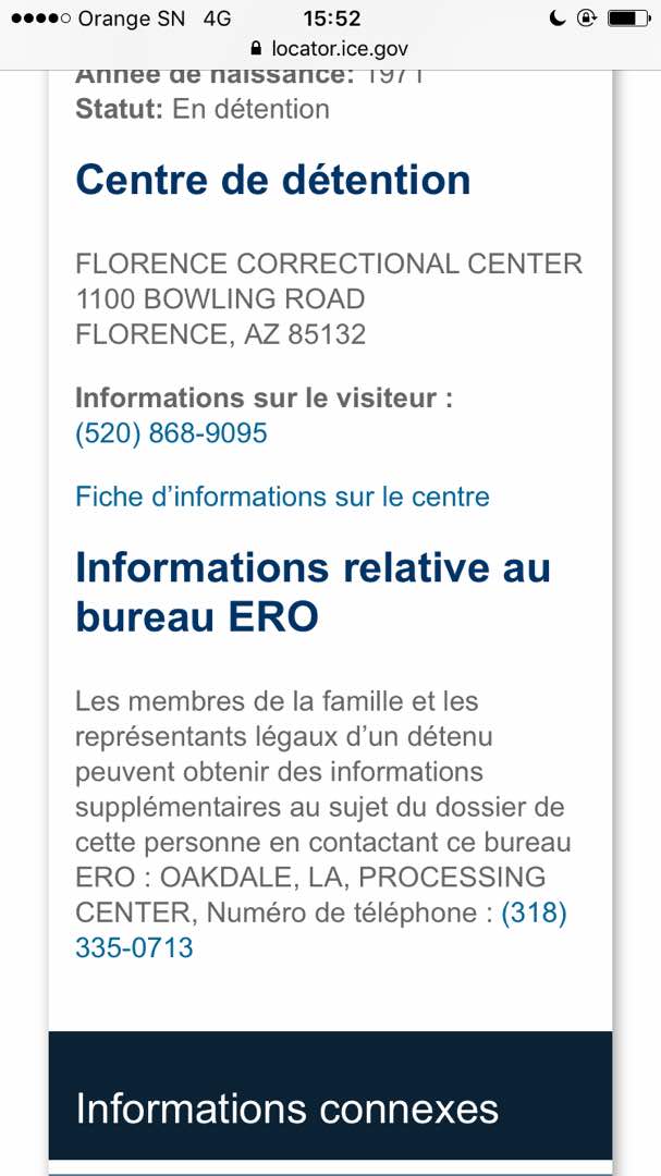 Assane Diouf localisé au Centre correctionnel de Florence, en Arizona