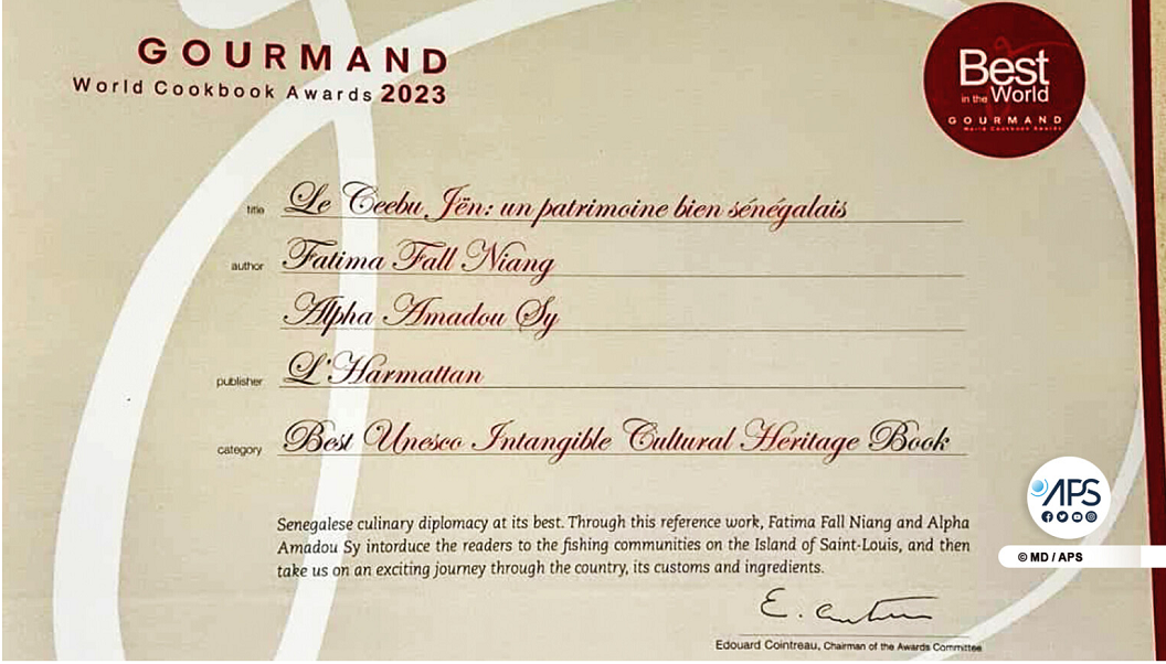 L’ouvrage »Ceebu Jën-un patrimoine bien sénégalais » a remporté le premier prix aux « Gourmand Awards 2023″ devant cinq ouvrages ayant concouru et provenant de la France, de l’Ukraine, de la Belgique, de Oman et du Mexique.