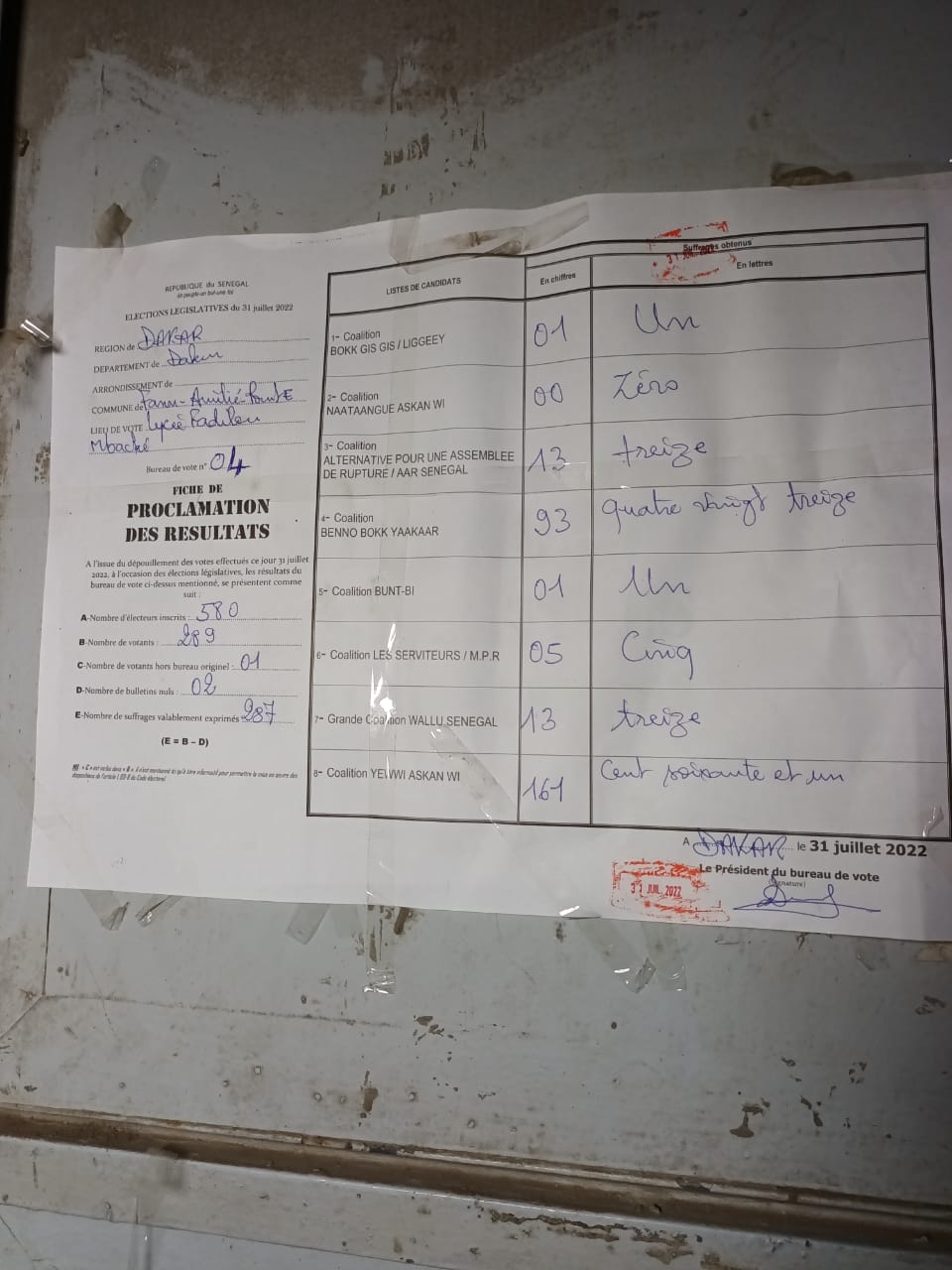 Revenu au Sénégal pour donner de la force à l’inter-coalition Yewwi Askan Wi-Wallu Sénégal, Me Abdoulaye Wade a également voté au centre Fadilou Mbacké de Fann Amitié Point E. Le Pape du Sopi, qui garde encore la cote, a remporté son bureau de vote avec 161 voix pour Yewwi (et 13 pour Wallu), alors que Benno y récolte 93 voix.