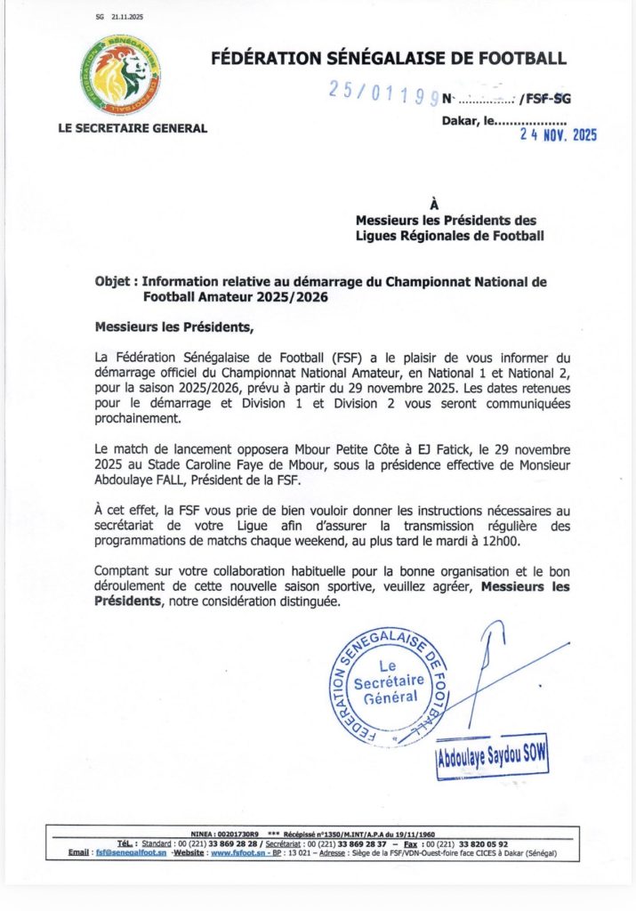 La Fédération Sénégalaise de Football (FSF) a annoncé le lancement officiel de la saison 2025/2026 du Championnat national Amateur, regroupant le National 1 et le National 2. Le coup d’envoi est fixé au 29 novembre 2025, conformément à la note circulaire adressée aux présidents des Ligues Régionales.