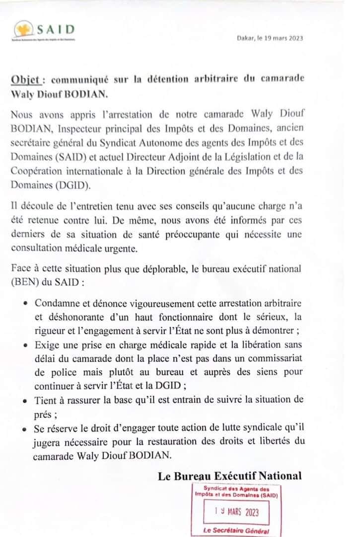 Les syndicalistes ont immédiatement fait savoir dans un communiqué reçu ce dimanche 19 mars 2023, que « nous avons appris l'arrestation de notre camarade, inspecteur principal des Impôts et des Domaines, ancien secrétaire général du Syndicat Autonome des agents des Impôts et des Domaines (SAID) et actuel Directeur Adjoint de la Législation et de la Coopération internationale à la Direction générale des Impôts et des Domaines (DGID). Il découle de l'entretien tenu avec ses conseils, qu'aucune charge n'a été retenue contre lui ». De plus, ils ont avancé qu'ils ont été informés de sa situation de santé préoccupante qui nécessite une consultation médicale urgente.