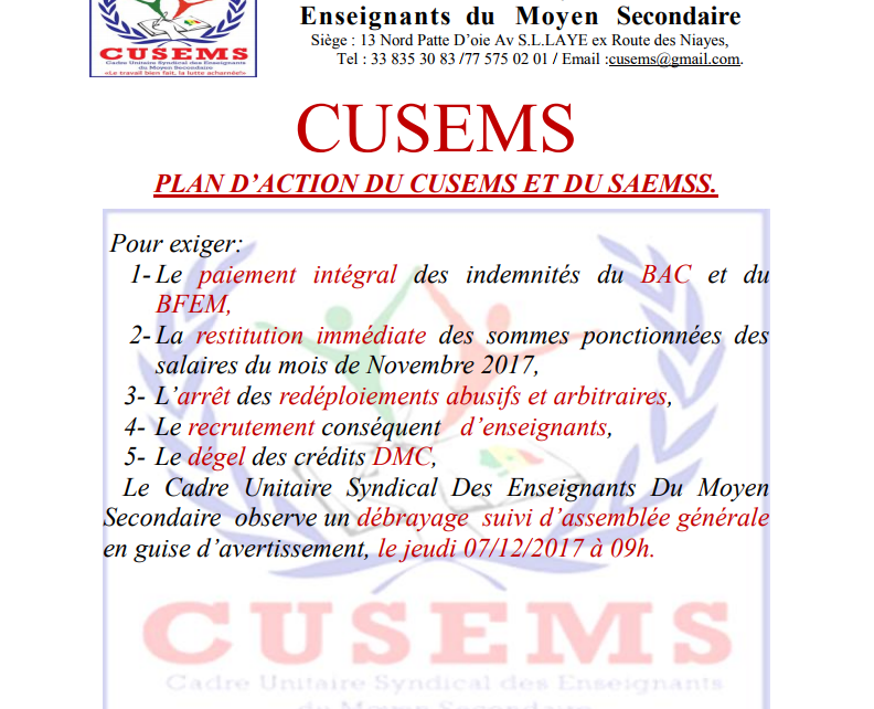 Les enseignants du Saems/Cusems exigent ce qui suit : le paiement intégral des indemnités du BAC et du BFEM, - la restitution immédiate des sommes ponctionnées des salaires du mois de Novembre 2017, - l’arrêt des redéploiements abusifs et arbitraires, - le recrutement conséquent d’enseignants, et le dégel des crédits DMC.