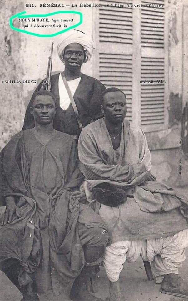 Mon sang n’a fait qu’un tour lorsque sur cette image (ci-dessous) j’ai vu marquer "MODY MBAYE, agent secret qui a découvert Sarithia". Cette image est historiquement trompeuse parce qu’elle ne dit pas tout sur la vie de cet homme qui a été selon moi, un résistant qui ne cessait de se battre contre les chefs traditionnels véreux et les administrateurs coloniaux malhonnêtes. Il s’était mis au service des populations et se battait activement pour leurs droits politiques. Beaucoup d’hommes politiques locaux durant la colonisation, lui doivent leur carrière.