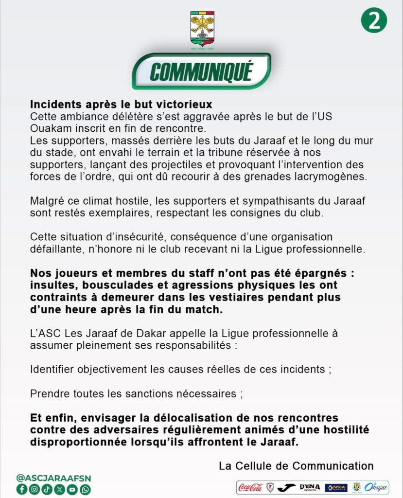 Le Jaraaf affirme que ses joueurs et supporters ont fait preuve de retenue malgré « un climat de violence et d’hostilité ».
