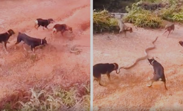Insolite : 5 chiens s'attaquent à un serpent, le combat est épique, regardez