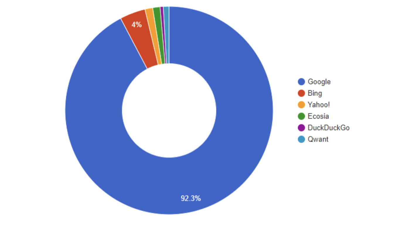 En dépit de sa position de monopole, Google n'est pas internet, Google n'est « que » le moteur de recherche numéro 1 dans le monde. En effet, Google se place en première position. Et cumule plus de 90 % des recherches au Sénégal, en Guinée ou en France, en recherches effectuées.