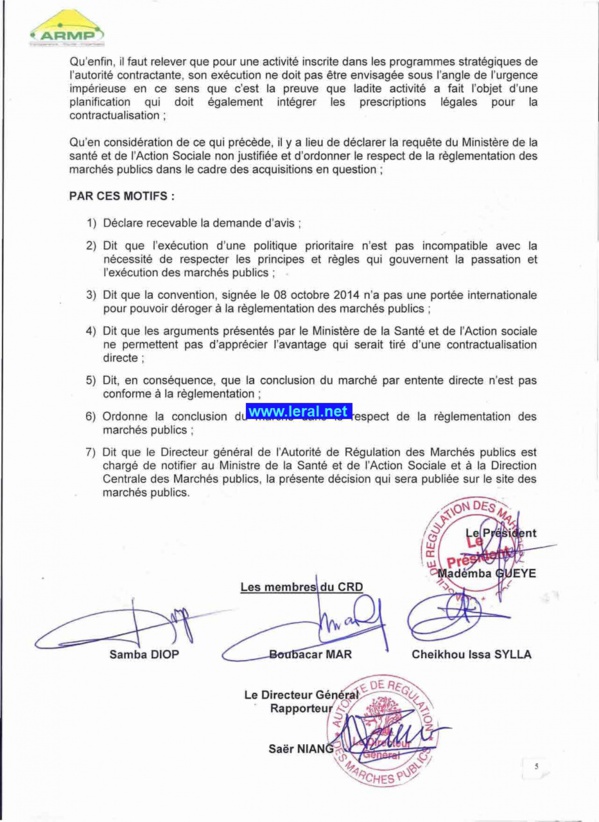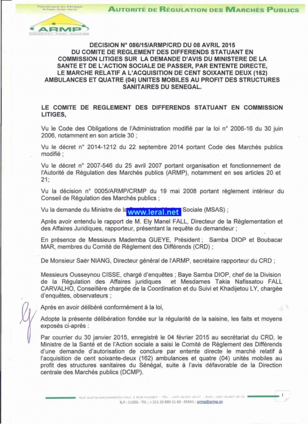Hier encore,  une nouvelle affaire de gré-à-gré déguisé de 10 milliards que le ministère de la santé veutdonner à Mecomar Société marocaine évoluant dans le ramassage de poubelle a été évoquée par la presse.  Avant même que ce marché ne soit lancé, le président de la République Macky Sall, en présence du roi du maroc à Diamniadio ont prétendu nous présenter des camions et des ambulances acquis par le Sénégal.  Les images sont encore disponibles sur Youtube. On y voit Demba Diop Sy le démarcheur des marocains et le président apprécier. Or il n’y avait  ni marché passé ni don comme on a voulu le faire croire aux populations. Certains organes de presse avaient annoncé que le deal était financé par la BNDE et Bank of Africa. Or, la réalité était que la DCMP et l’ARMP  avaient refusé de cautionner le gré à gré et l’urgence invoquée par le ministère de la santé pour contourner les procédures et imposer les marocains.  Pour forcer l’ARMP et la DCMP à revenir sur leur refus, avec l’influence du palais, le ministère de la santé a invoqué l’Ebola comme raison impérieuse. Une vraie farce.  Sous la pression, la DCMP et l’ARMP  viennent de renverser leur position en arguant le contraire de leurs arguments précédents. De quoi ridiculiser ces organes de régulation.