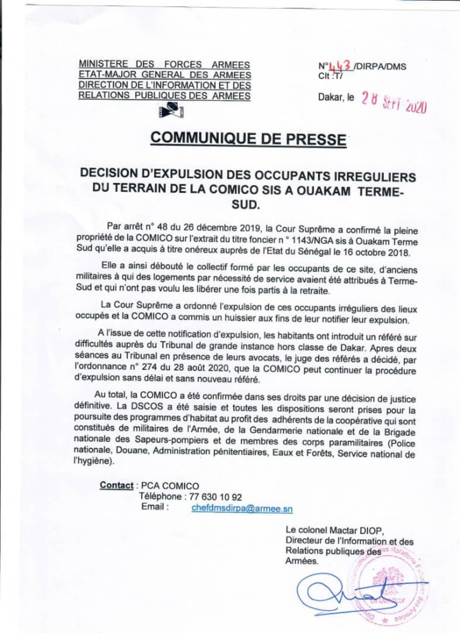 En Octobre 2018, la Cour Suprême ordonnant l’expulsion des occupants irréguliers de la Cité Comico sis à Ouakam Terme Sud, un huissier a été saisi aux fins de notification de cette décision.