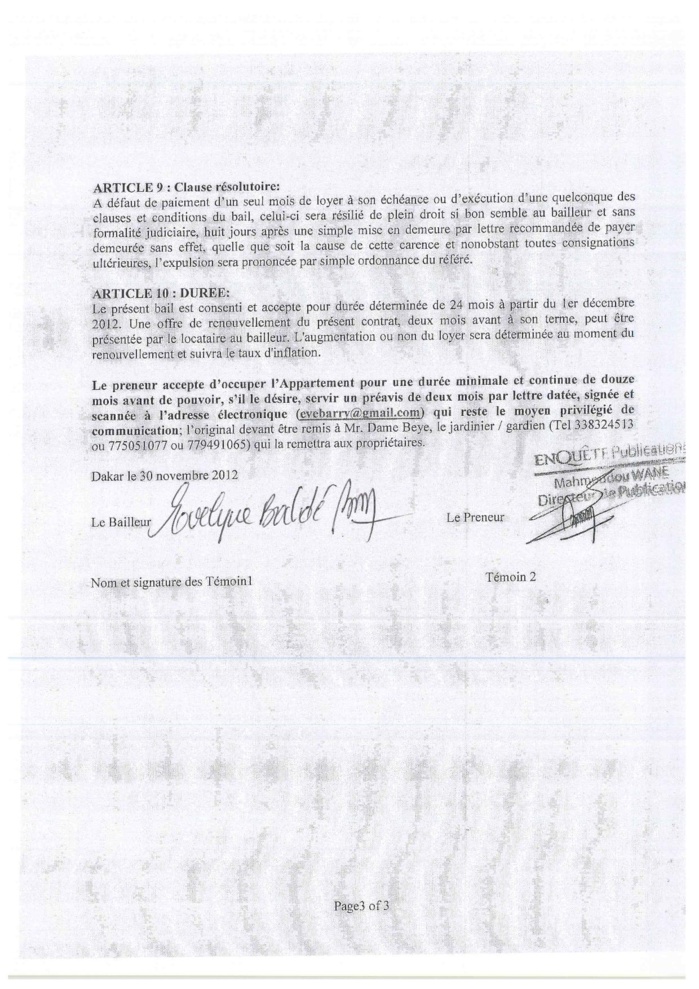 Dans l’une de ses publications sur Facebook, le journaliste Adama Gaye écrit photos à l’appui, que Mouhamadou Makhtar Cissé a, à Hann-Marinas, un immeuble dans lequel il loge « gratuitement » le journaliste Mamadou Wane, "son homme à tout faire". Comme nous l’indiquions dans une précédente publication, c’est un gros mensonge. L’immeuble appartient au couple Baldé, dont le mari est un fonctionnaire des Nations-Unies. Leral s’est procuré d’une copie du contrat de bail établi le 30 novembre 2012 entre les parties. Voici les détails du contrat de location.