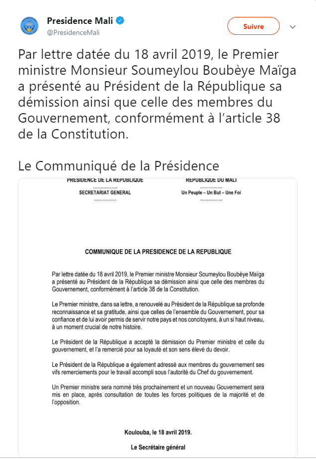 Soumeylou Boubèye Maïga a présenté sa démission et celle de son gouvernement, qui a été acceptée par Ibrahim Boubacar Keïta, nous apprend le communiqué de la présidence malienne, publié dans la soirée du 19 avril. Dans sa lettre de démission, Soumeylou Boubèye Maïga remercie le chef de l'État pour la confiance qu'il a placée en lui pendant un an et quatre mois. En retour, le président « a remercié » le Premier ministre sortant « pour sa loyauté et son sens élevé du devoir ».