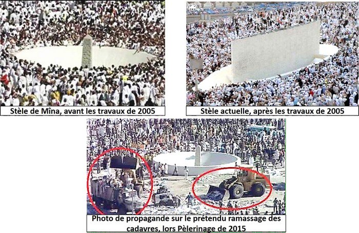 Tout le monde sait qu’après la bousculade meurtrière de 2005 (qui avait fait 251 victimes) l’Arabie Saoudite avait décidé d’entamer une série de travaux d’agrandissement des infrastructures, pour améliorer la mobilité des pèlerins. De nouveaux ponts furent construits sur plusieurs niveaux, dont le 5e étage fut achevé en 2009 ; pendant que la finition des toitures et la consolidation des piliers furent achevées en 2010. C’est justement à l’occasion de ces grands chantiers que la stèle (bien visible sur la photo des propagandistes) avait complètement disparu du paysage de Mîna !
