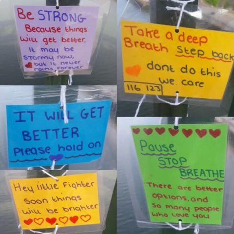Anonymous post I want to say a massive THANKYOU!! to the young girl paige hunter for not only saving one life but for saving 2 and probably many more. At 6pm i went down to the bridge with every intention of ending my life to not only find when i get there bright coloured notes at least 40 each side. As i was about to climb over i stopped at a sign that said "be STRONG because things will get better, it may be stormy now but it never rains forever" and alot more. If it was not for paige i would have been at the bottom of the river and my family would have been broken. So THANKYOU!!! You are a beautiful young lady with heart of gold and deserve recognition for doing what you did