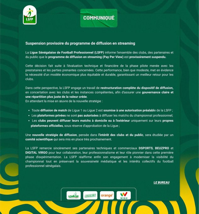 Bonne nouvelle pour les amateurs du foot local. La Ligue sénégalaise de football professionnel a suspendu le programme de diffusion en streaming (Pay per view).