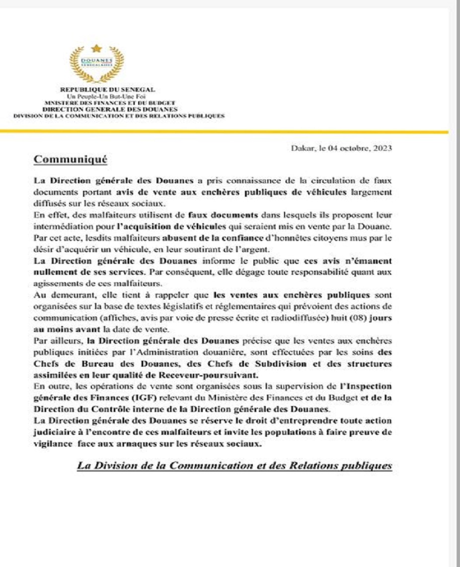 Des malfaiteurs utilisent de faux documents dans lesquels ils proposent leur intermédiation pour l'acquisition de véhicules, qui seraient mis en vente par la Douane. L’alerte est de la Direction générale des Douanes qui, dans ce communiqué et reprécise les règles, pour édifier les Sénégalais et autres intéressés…