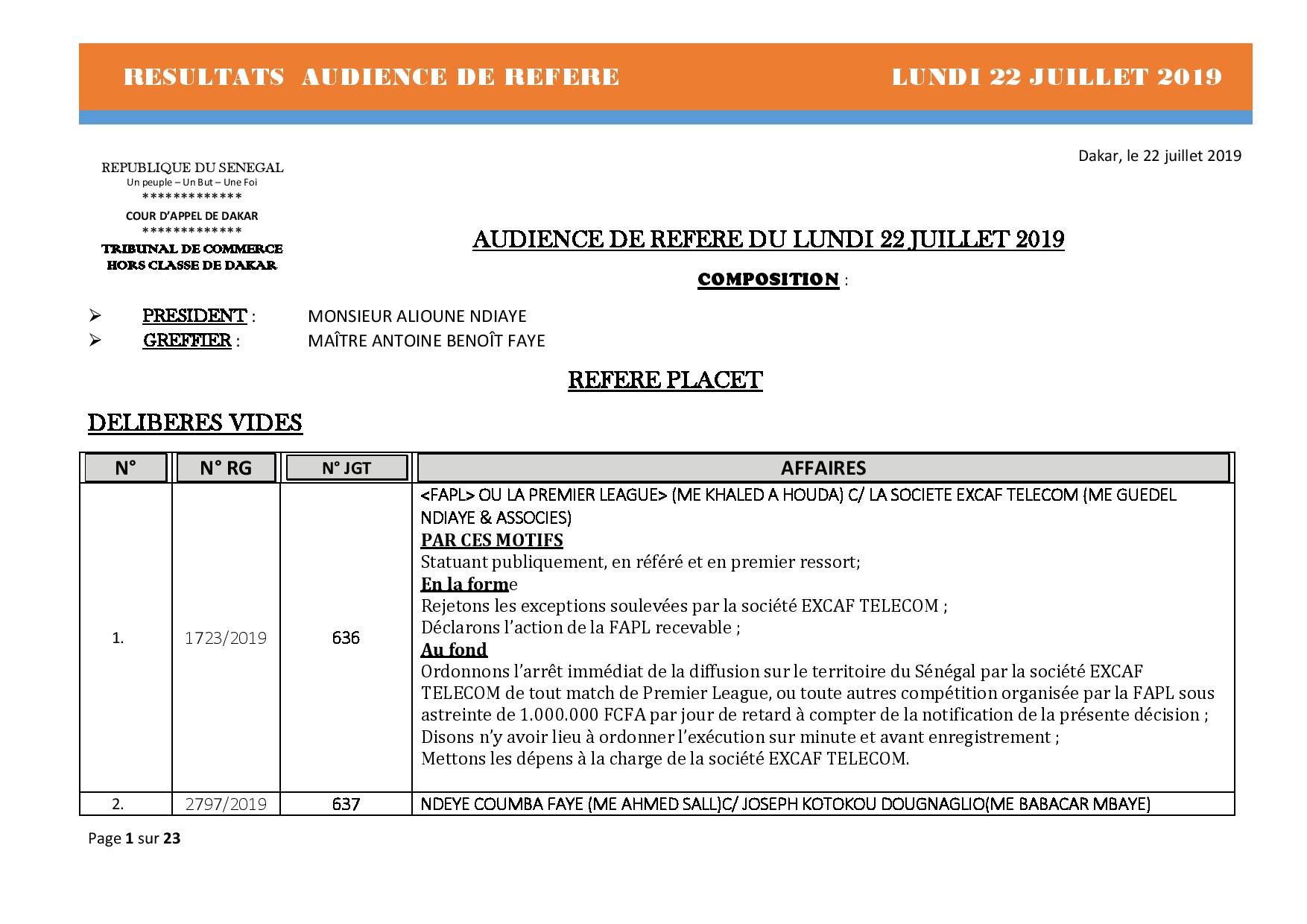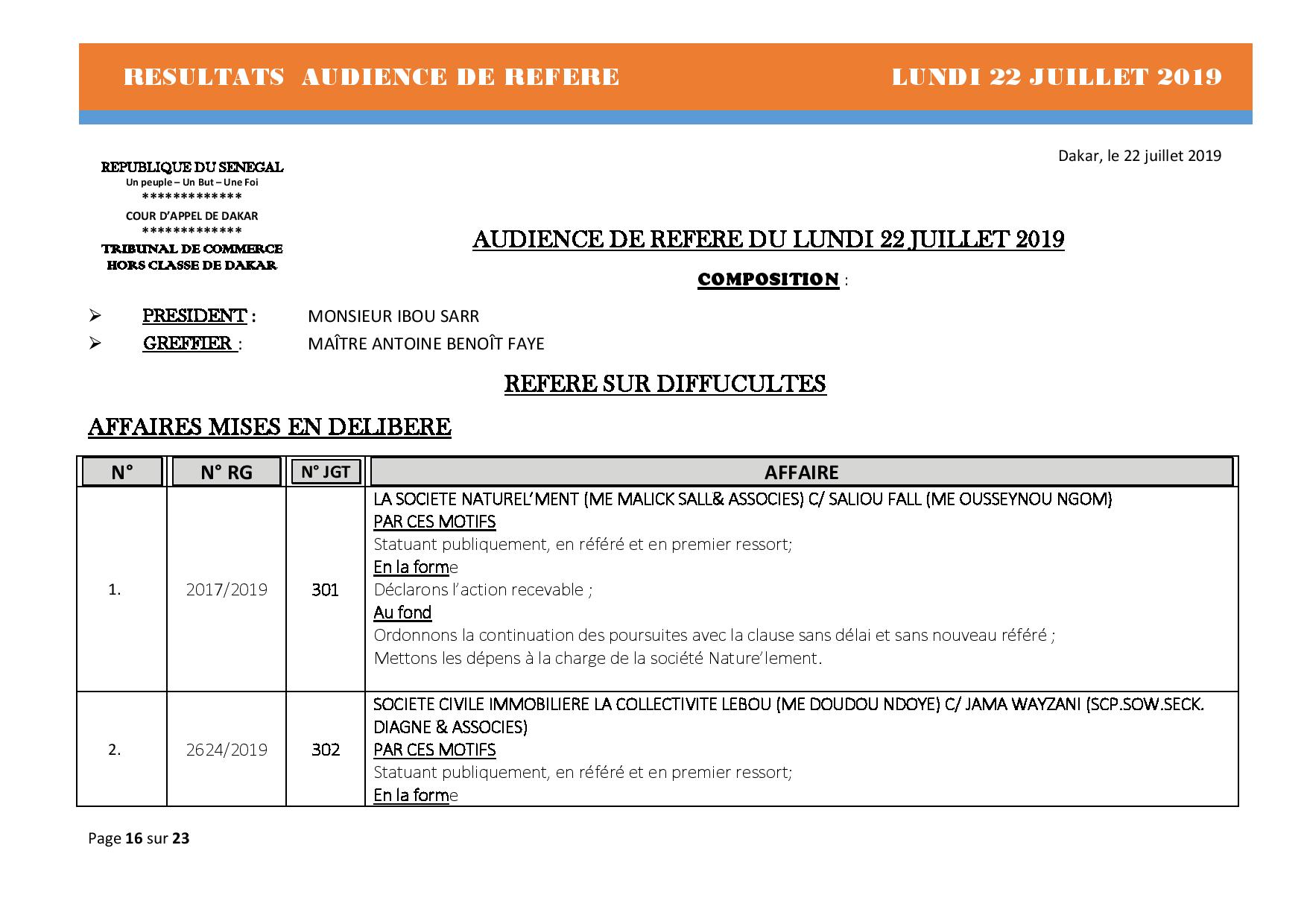 Tribunal du Commerce: Délibérés Audiences des Référés du lundi 22 juillet 2019
