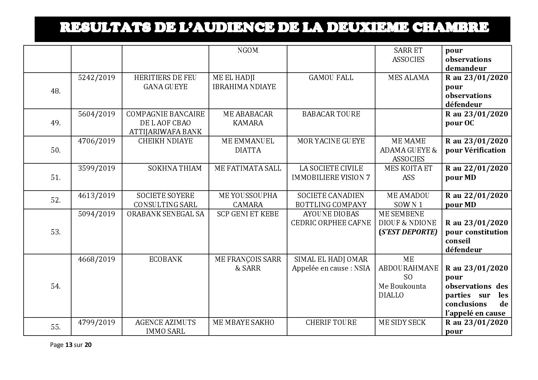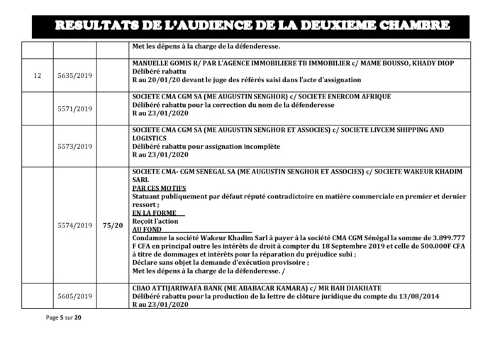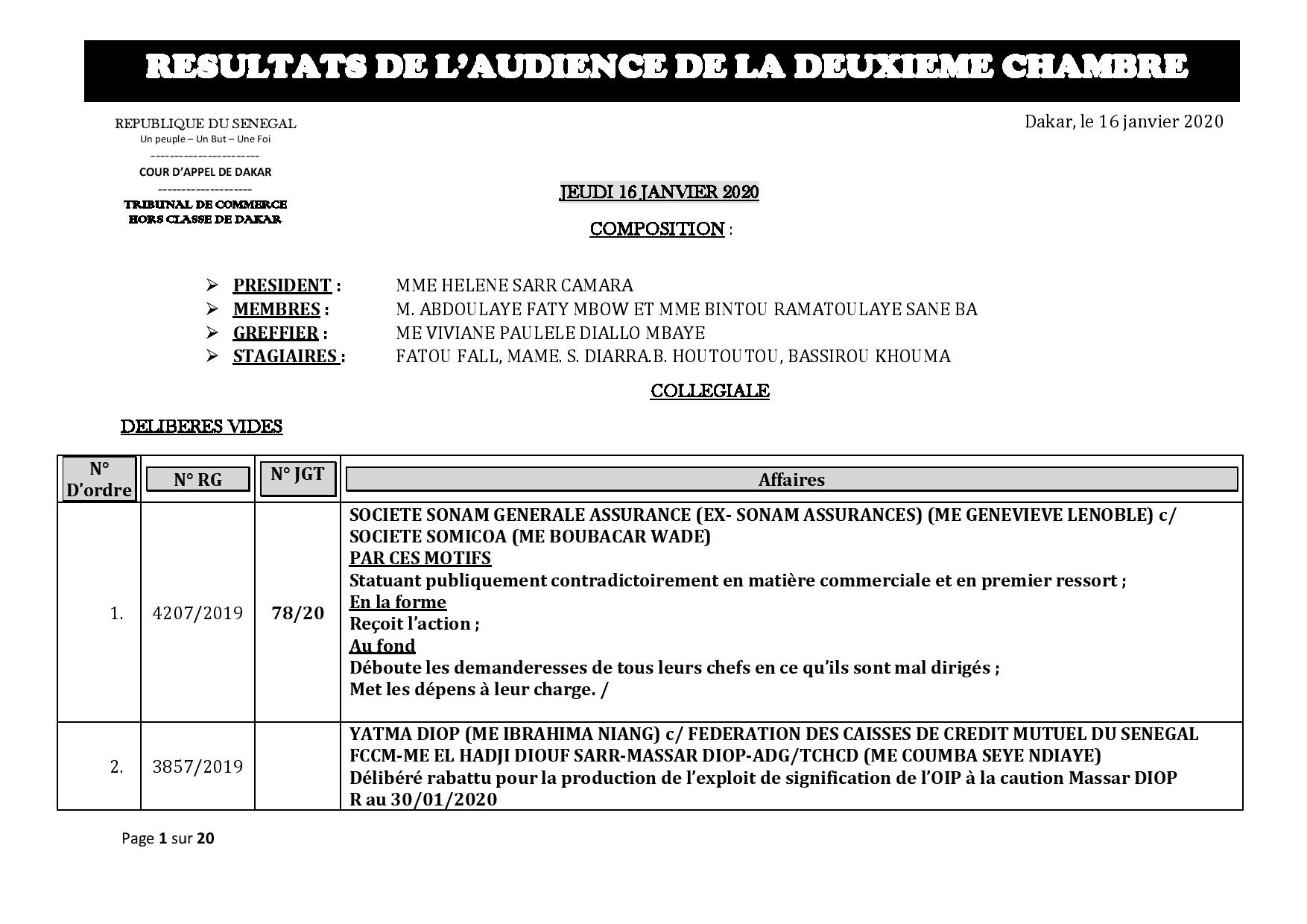 Tribunal du Commerce: Délibérés des Audiences de la 2e Chambre du jeudi 16 janvier