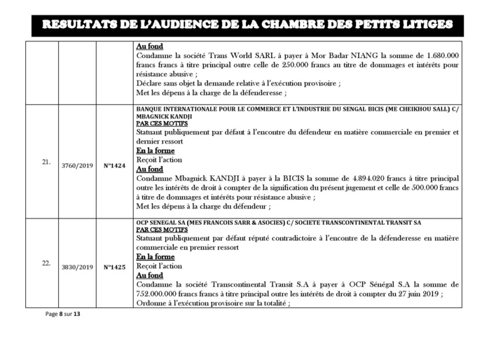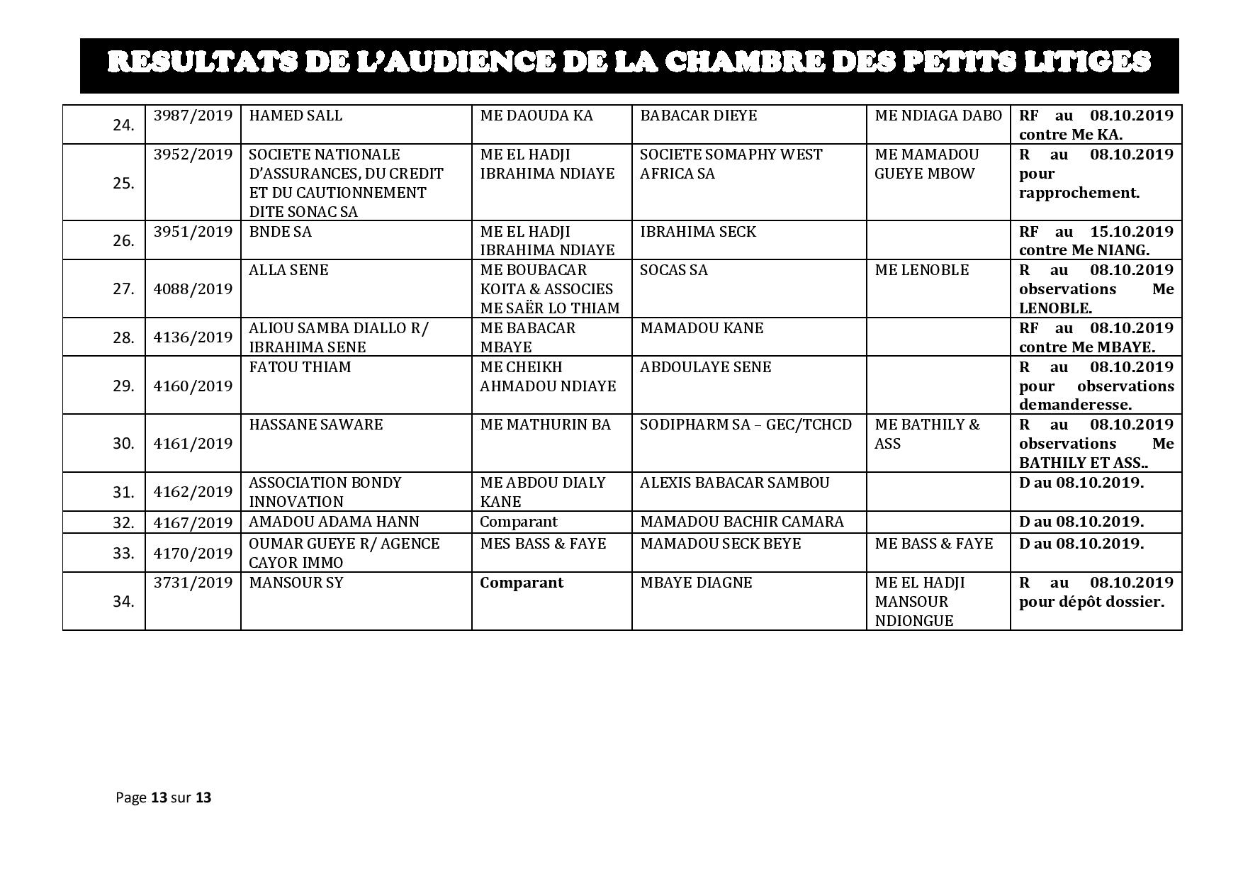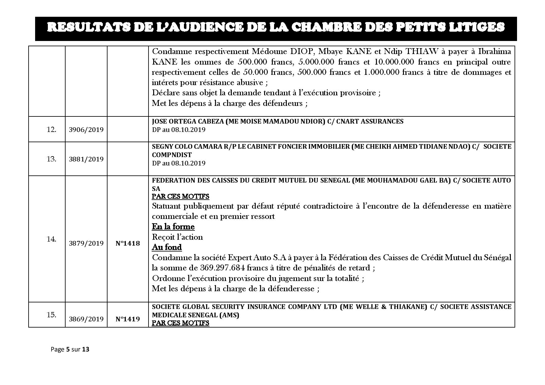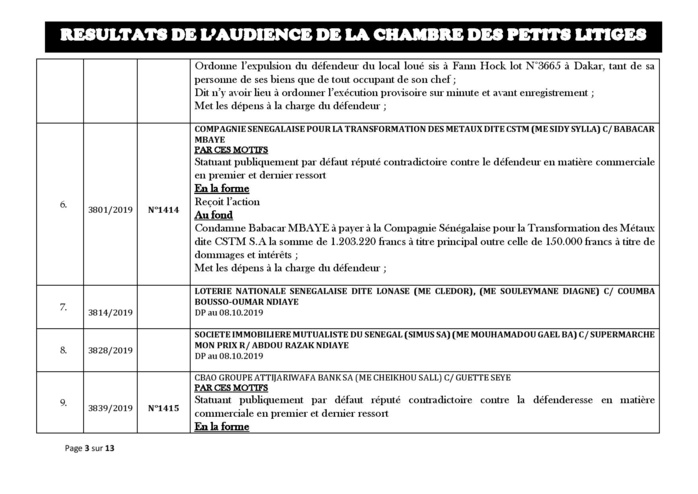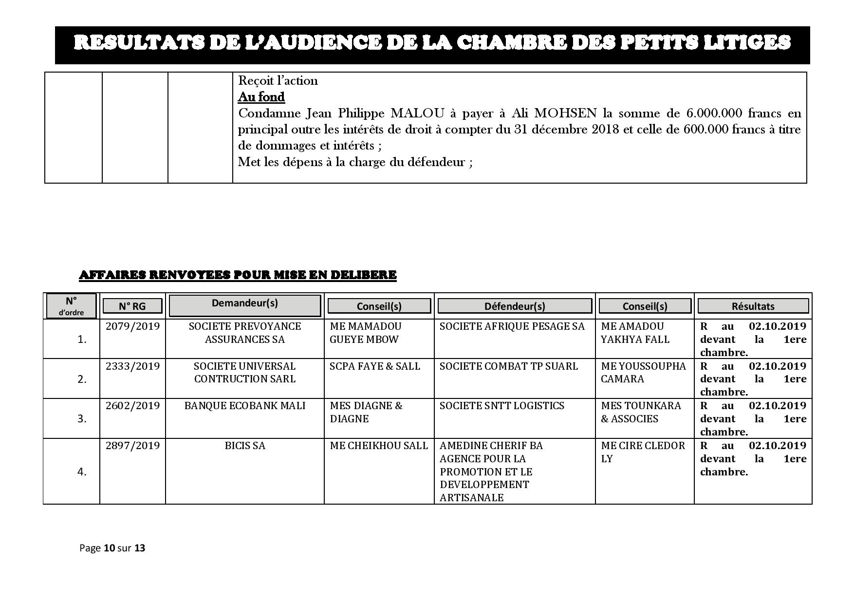 Tribunal du Commerce: Délibérés des Audiences de la Chambre des Petits Litiges du mardi 1 octobre
