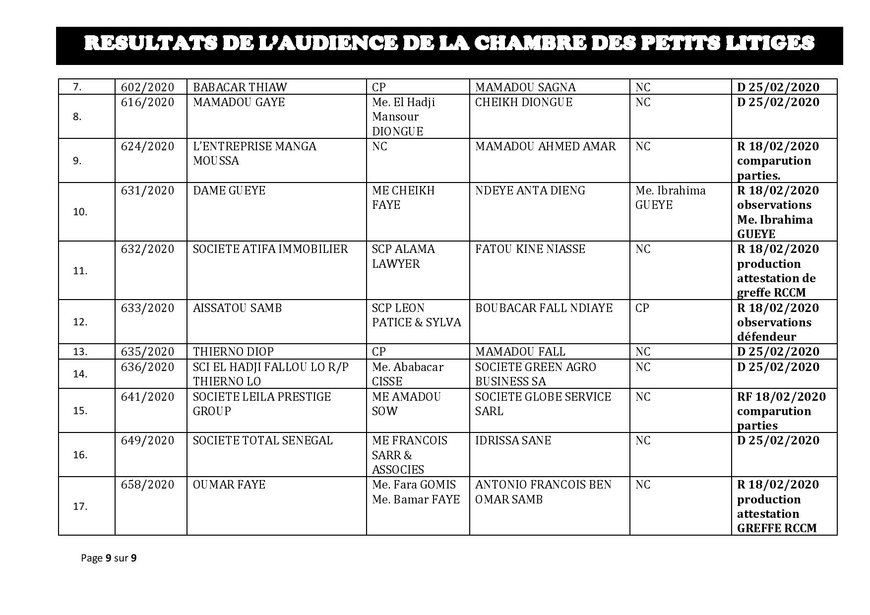 Tribunal du Commerce: Délibérés des Audiences de la Chambre des Petits Litiges du mardi 11 février
