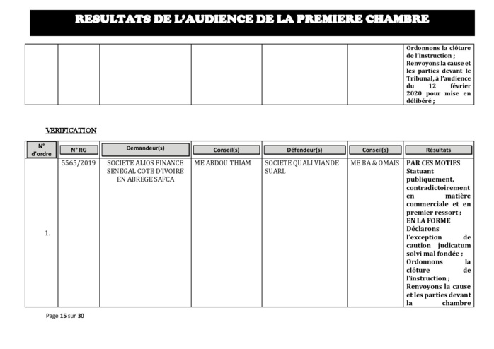 Tribunal du Commerce: Délibérés des Audiences de la Première Chambre du mercredi 5 février