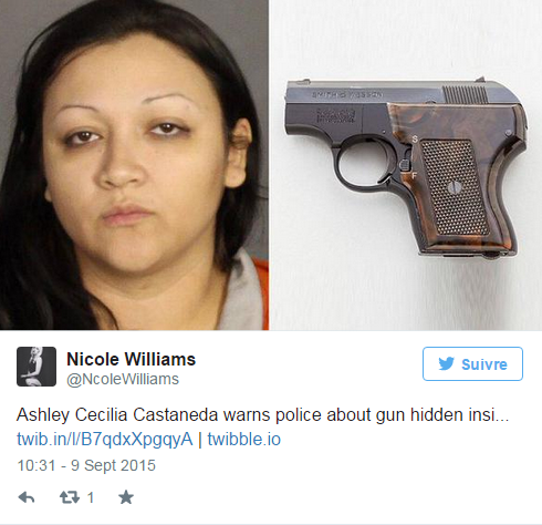 Ashley Cecilia Castaneda, 31 ans, a avoué à la police porter l'arme, d'un calibre .22 de Smith & Wesson, dans son bas ventre alors que les policiers l'emmenaient au poste après avoir découvert près de 30 grammes de méthamphétamines dans son portefeuille lundi soir.