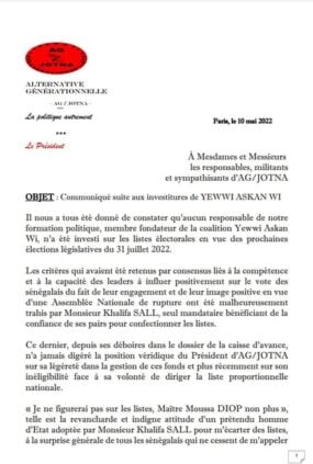 Aucun responsable de AG/Jotna n’a été investi sur les listes électorales de la Coalition Yewwi Askan Wi, en vue des prochaines élections législatives du 31 juillet 2022. L’ancien Directeur de Dakar Dem Dikk (DDD), Me Moussa Diop, a fustigé l’attitude de Khalifa Ababacar Sall.